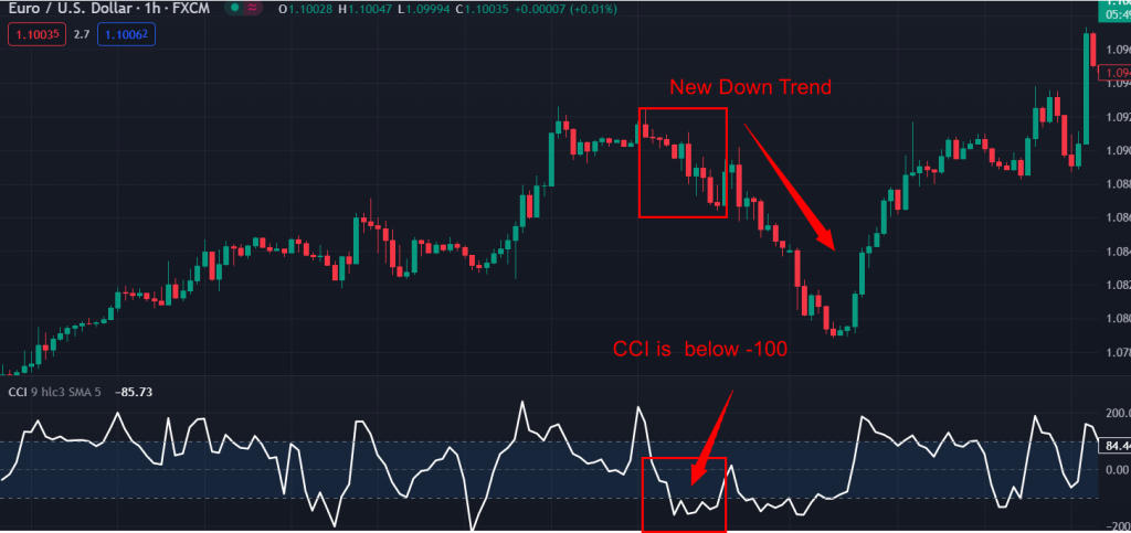 A bearish trend is identified when the CCI crosses below -100. Traders can use other indicators, such as moving averages, to confirm the trend direction.