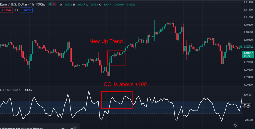 In trend following, traders use the CCI to identify the direction of the trend and enter trades in the same direction. A bullish trend is identified when the CCI crosses above +100
